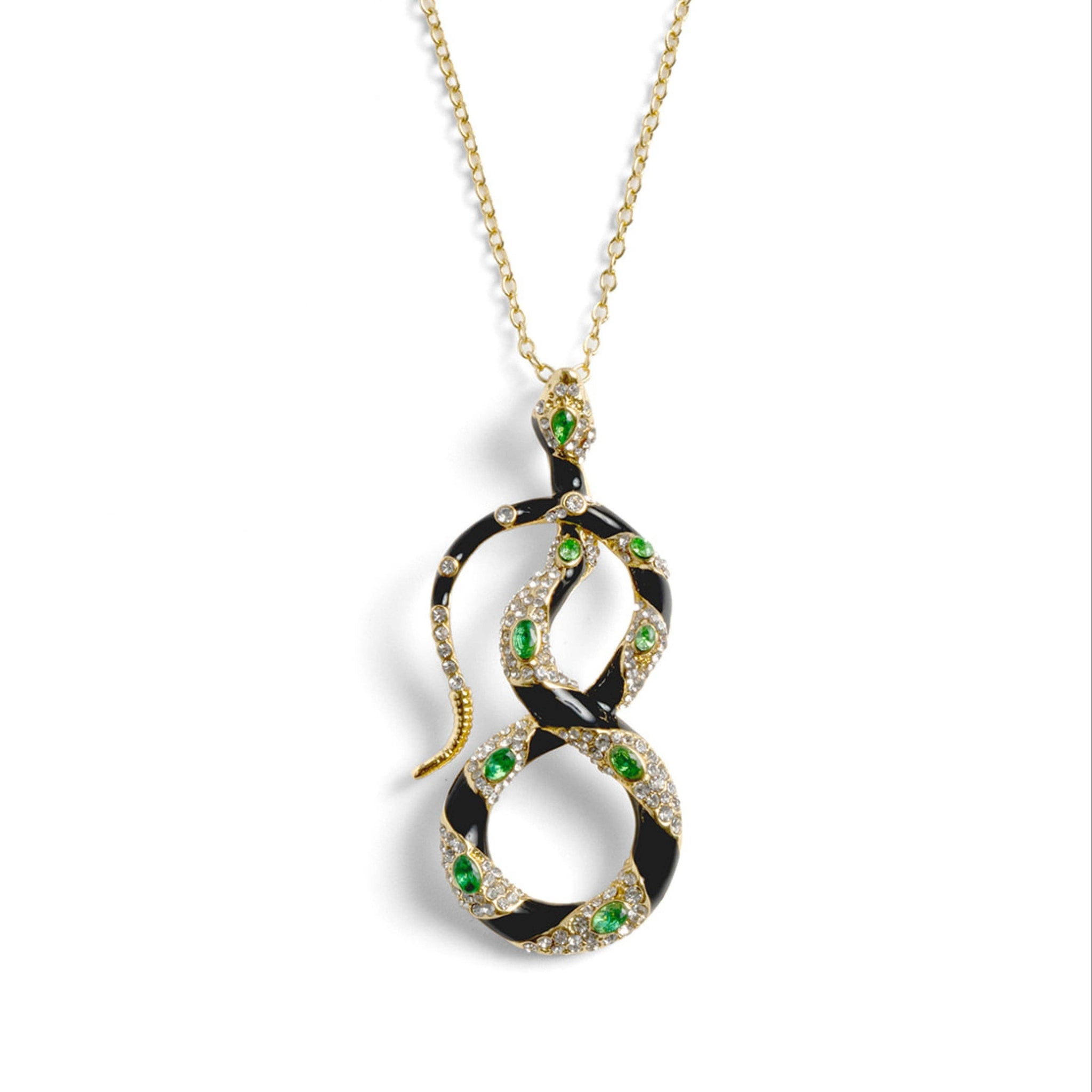 This captivating serpent pendant necklace is a miniature masterpiece designed to adorn your neckline. Crafted from high-polish gold-plated brass with striking hand-painted black enamel, its intricate form is brought to life. Shimmering emerald-green crystals are artfully set alongside dazzling clear crystals, catching the light with every turn.