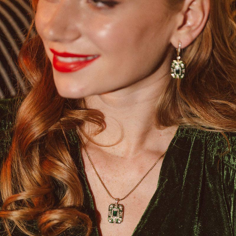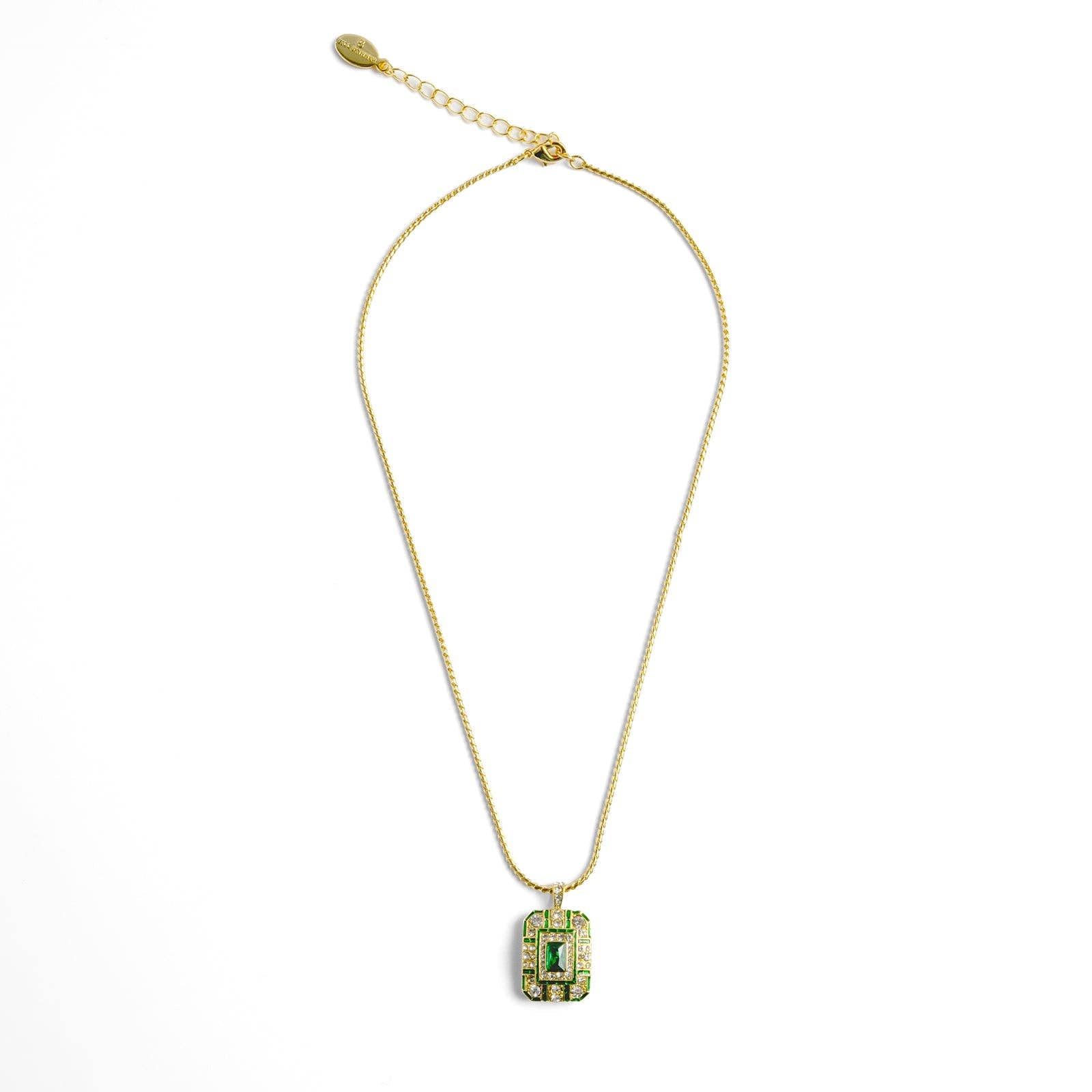 Capture the essence of vintage 1920's glamour with this stunning Art Deco necklace. A radiant emerald-cut crystal takes centre stage, framed by a geometric design adorned with vibrant green enamel and shimmering clear crystals, all set in a polished gold-plated finish. This exquisite pendant hangs elegantly from a 40cm chain, securing with a lobster clasp, offering a touch of timeless sophistication for any neckline.