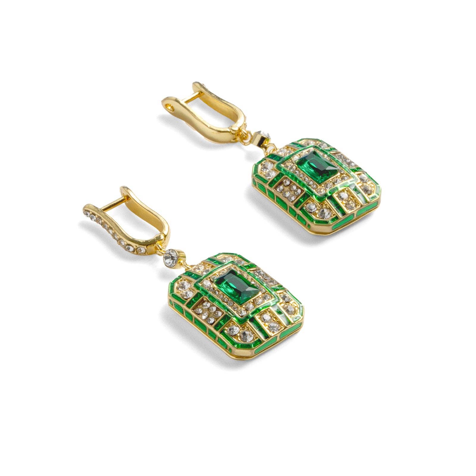 Step back into an era of glamorous sophistication with these exquisite Art Deco drop earrings. Crafted with a polished gold-plated finish, their geometric design is beautifully accented with vibrant green enamel.