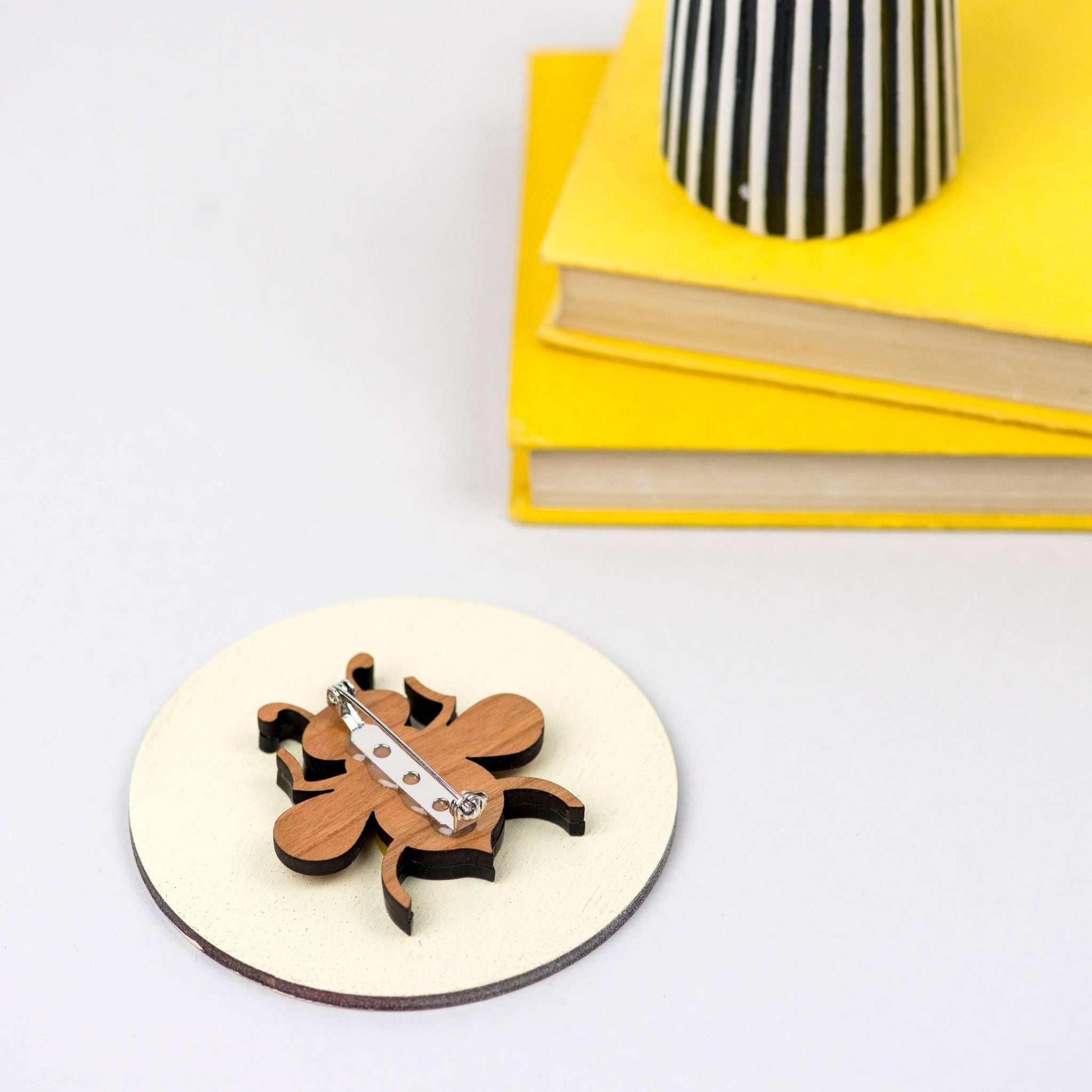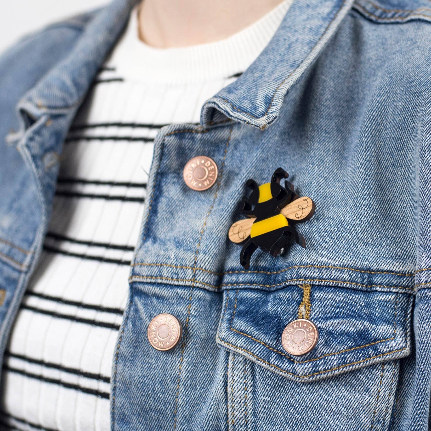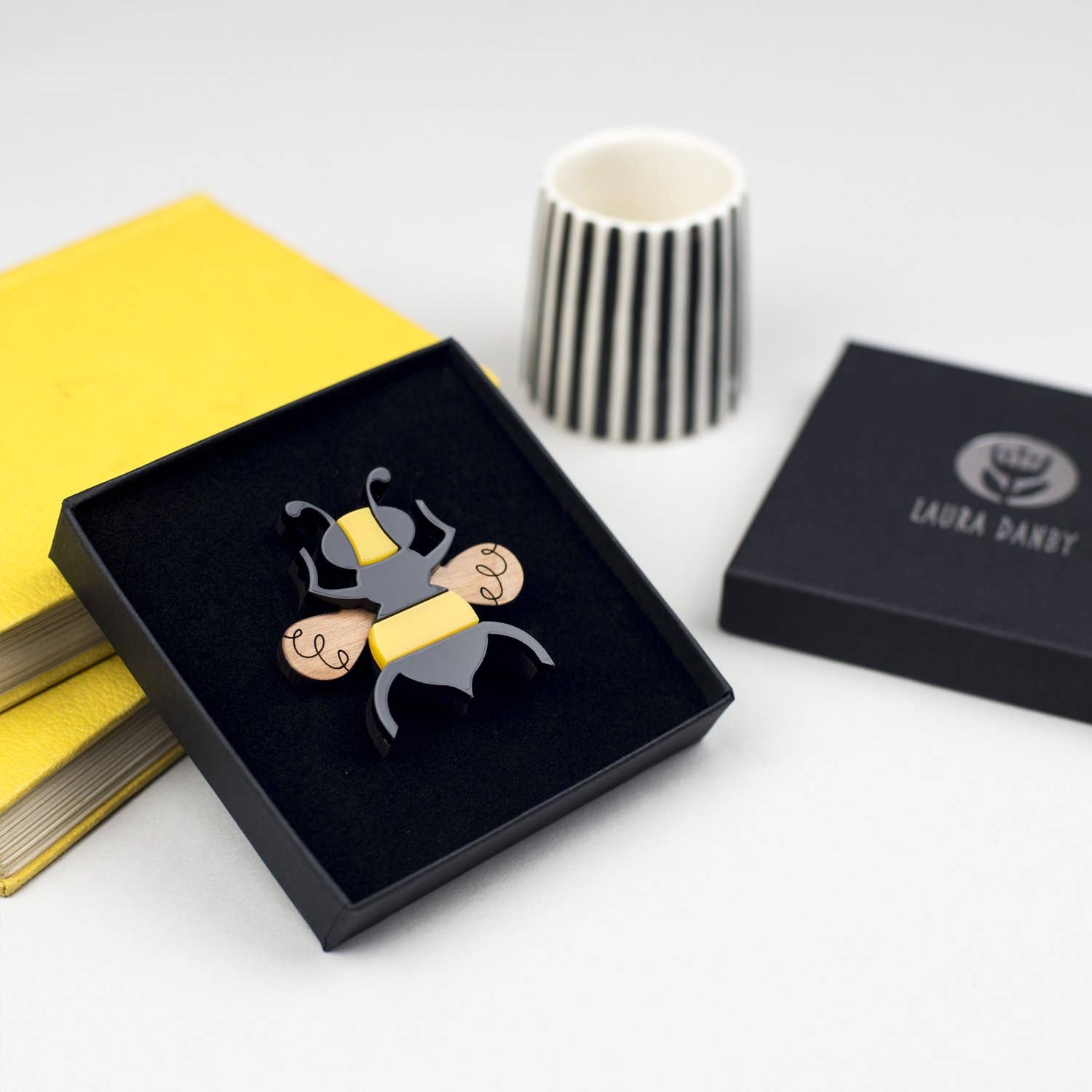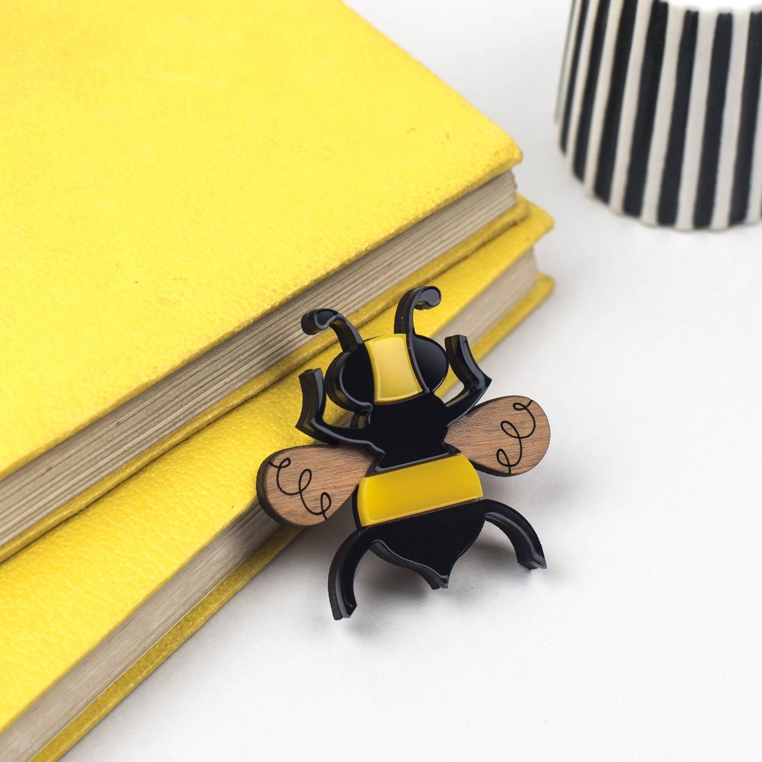 A bold yellow and black bee brooch, inspired by retro Scandinavian design Handmade from 70% recycled acrylic and engraved cherry wood, this little guy will brighten up any outfit whether you wear it on a lapel, backpack or pinned to your hat.