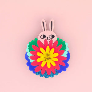 This cute brooch carries an empowering message, delivered in the unique illustrative style of Little Moose co-founder Carrie. Handmade from a selection of colourful, mirrored and glittered acrylics, our 'be you' brooch is finished off with hand-inked details.