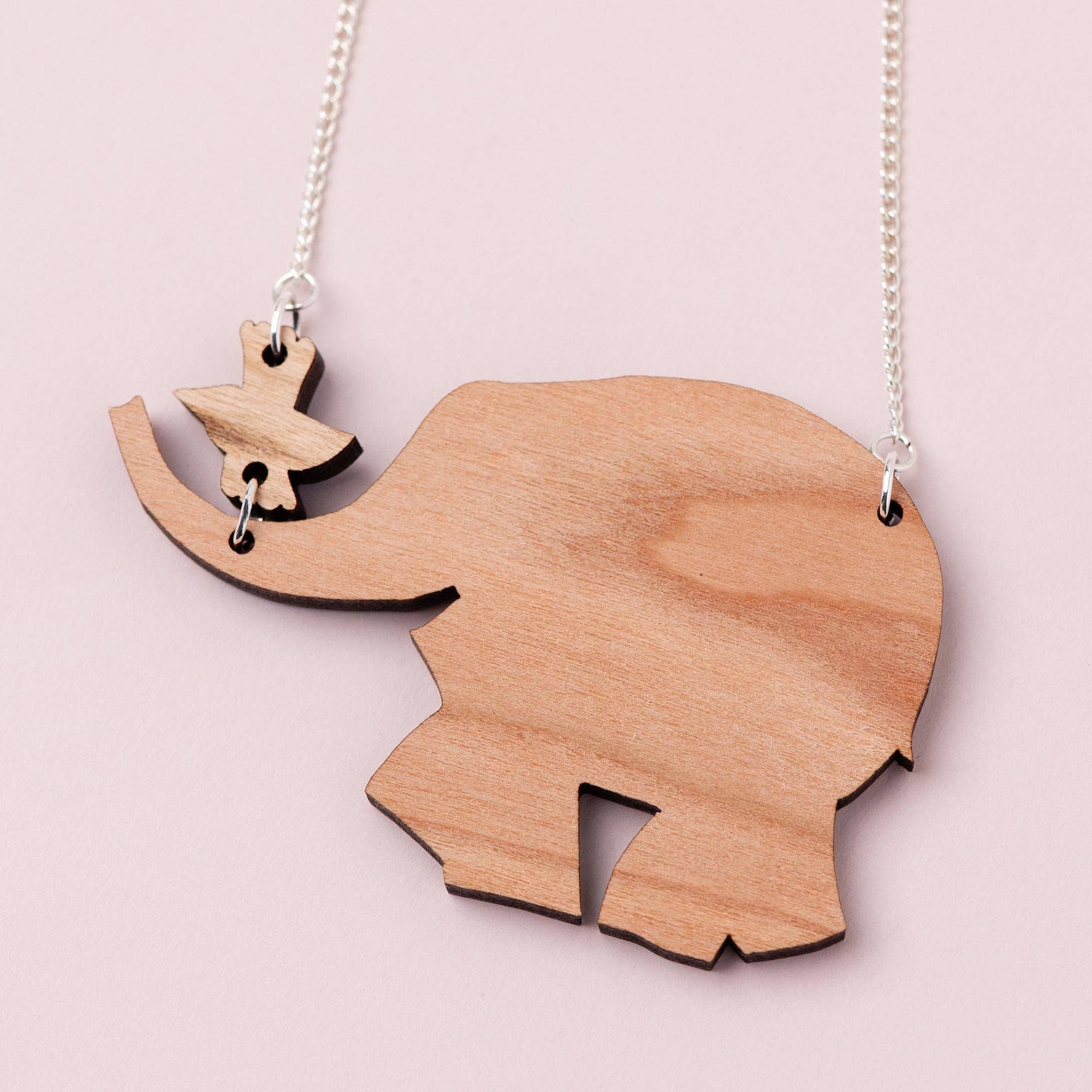 Made of 4mm cherry wood, the elephant and bird pendants are threaded on a silver plated necklace chain and designed to sit on your chest.