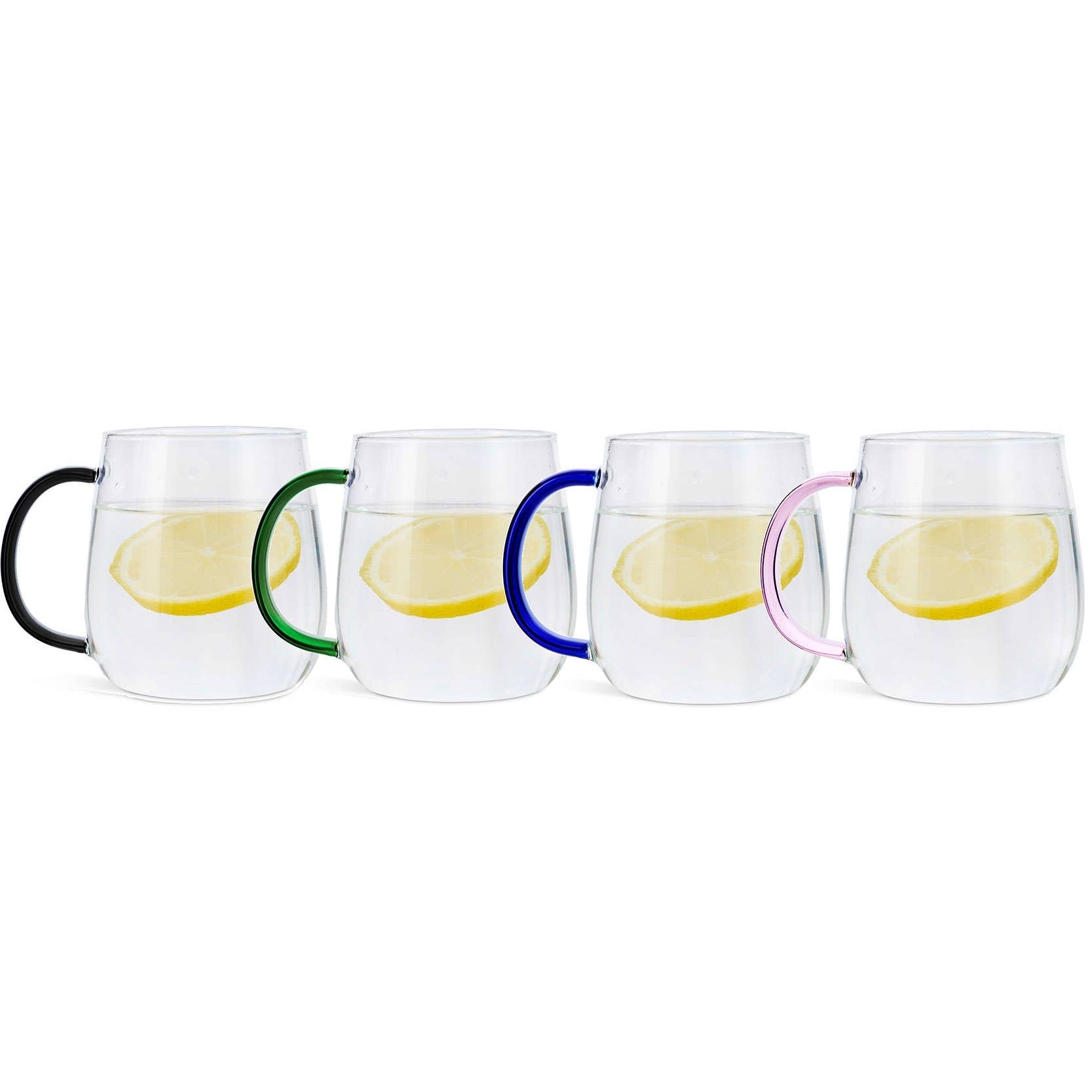 Set of four glass mugs, each featuring a uniquely coloured handle. Borosilicate glass is suitable for hot drinks.