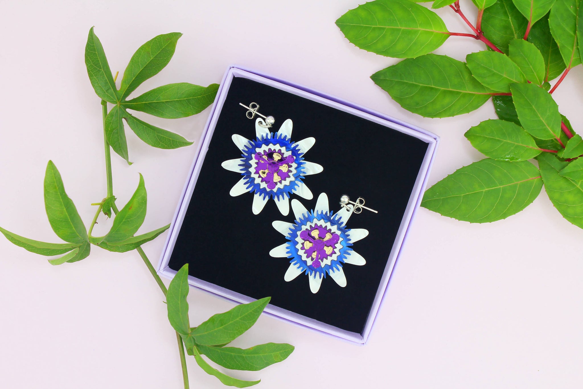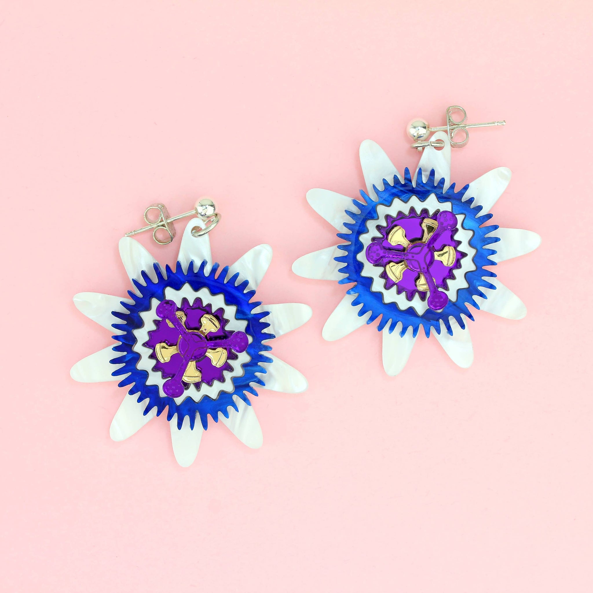 Vibrant and eye catching pair of passion flower earrings featuring mirrored and luxury pearl acrylic.