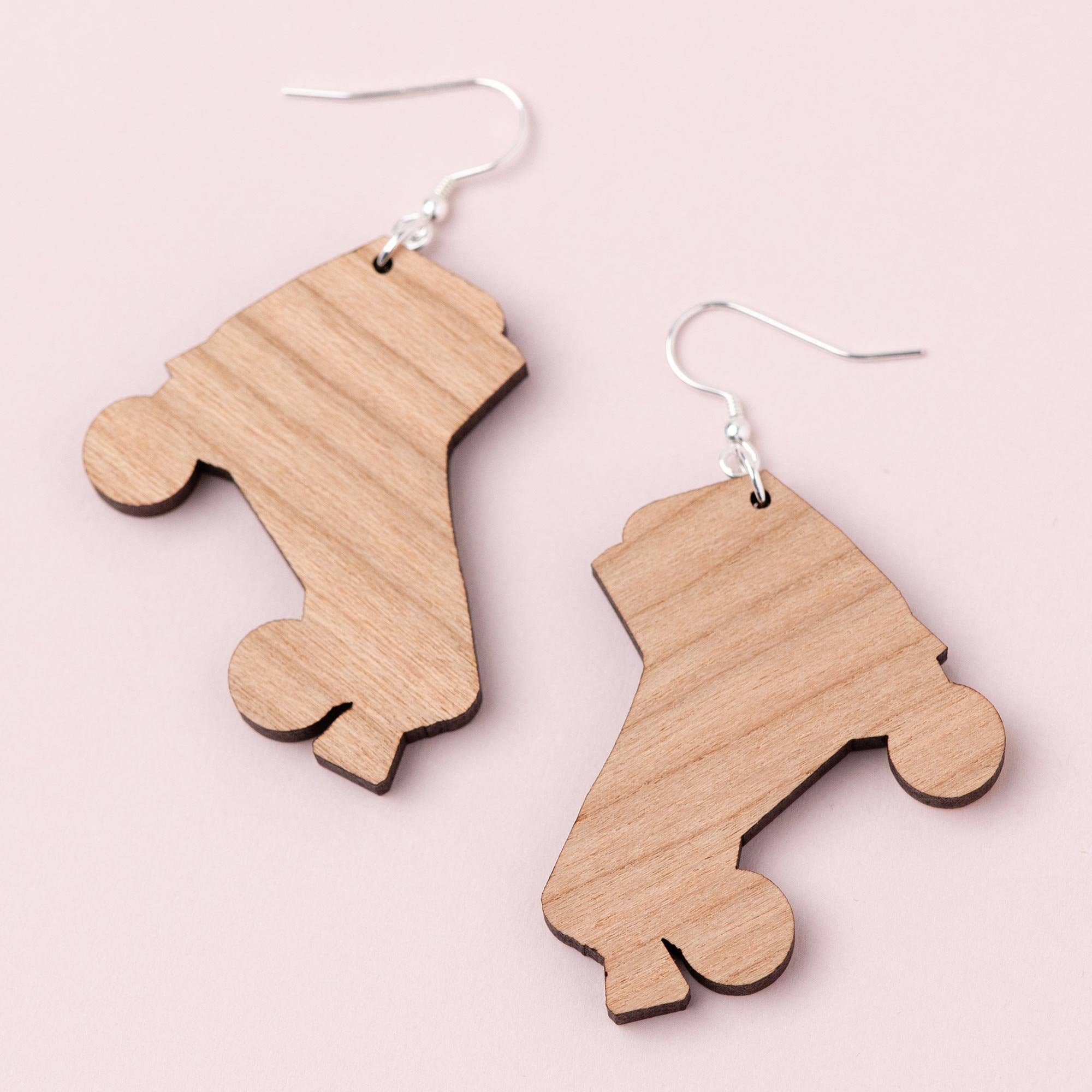 The statement earrings have silver plated hooks and are made from lightweight printed cherry wood, from sustainable forests. Dimensions: 5cm long by 5cm wide.