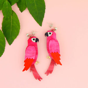 This pretty pair of parrot earrings is carefully handmade from layers of laser-cut acrylic. Each parrot is a luxurious red and pink marble and has a lovely etched, mirrored red wing and black crystal eye.